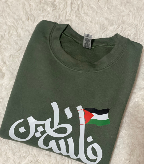 Arabic Calligraphy: Below the English text, the word “Palestine” (فلسطين) is rendered in a graceful, flowing Arabic script, adding a touch of cultural heritage.