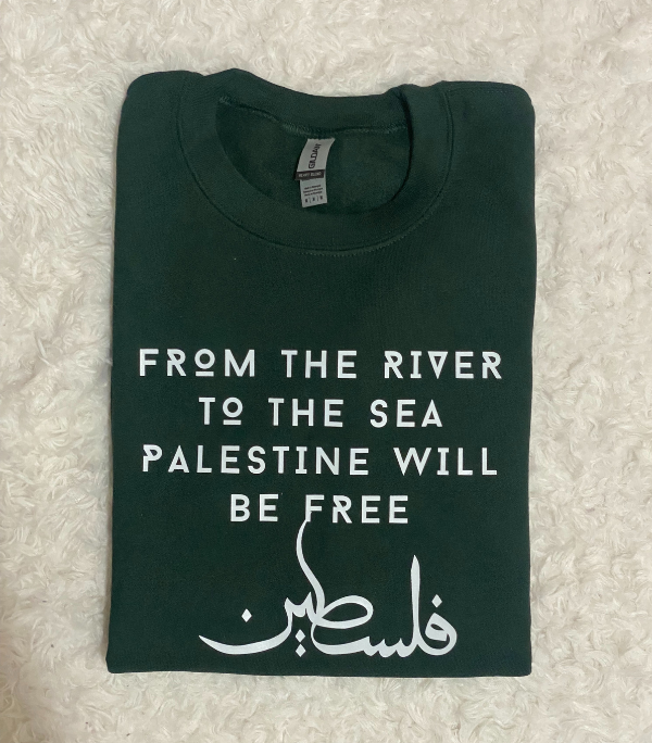 Powerful Slogan: Features the widely recognized phrase “FROM THE RIVER TO THE SEA PALESTINE WILL BE FREE” in bold, easy-to-read white English text.